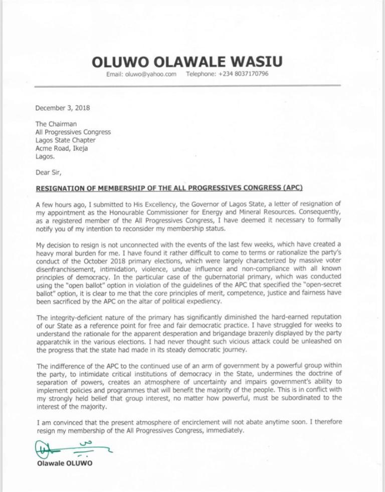 On why he resigned from the party, Oluwo, in the resignation letter, accused the leadership of the ruling party of being anti-democratic in the process through which Babajide Sanwo-Olu emerged as the flag bearer of the APC for the 2019 governorship election.