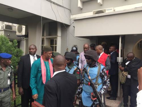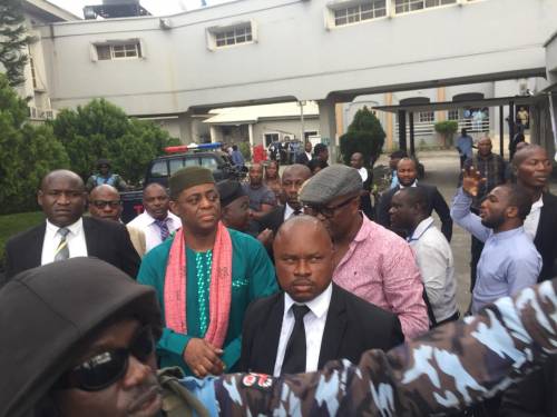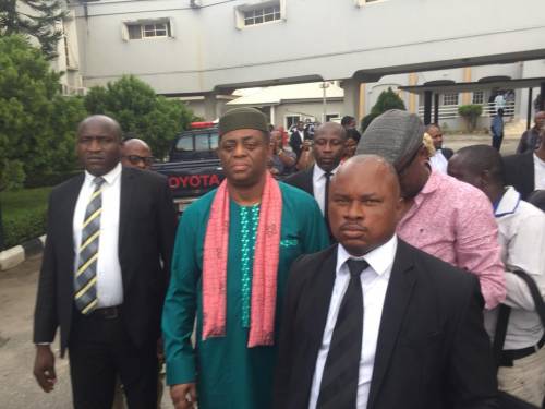 Fayose was brought to court shortly before 9am, and notable among those at the court to offer him support was Femi Fani-Kayode, former Minister of Aviation.