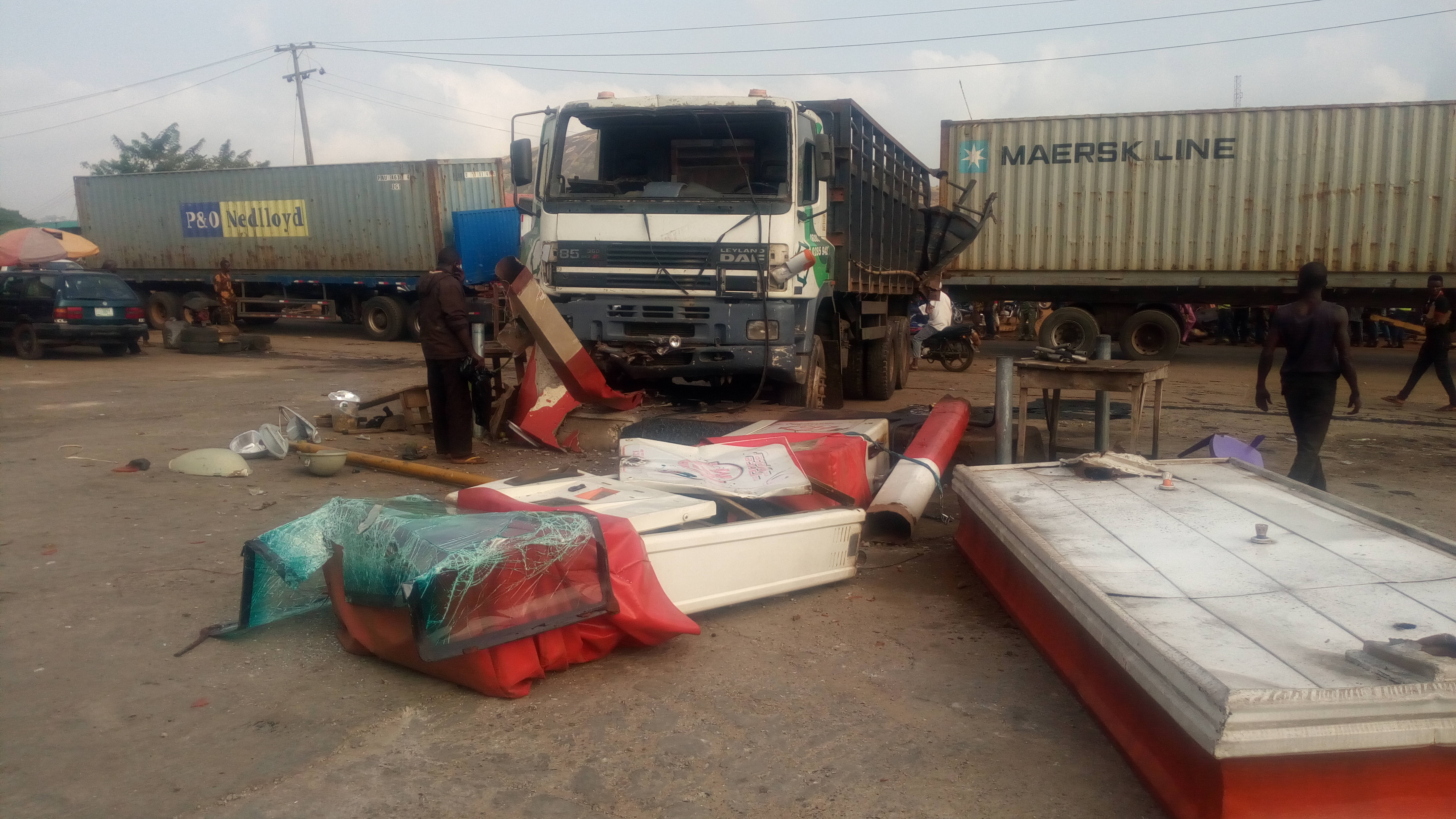 “We got information that a tanker had a break failure and hit a vehicle and entered into a filling station while the other truck, in trying to avoid the tanker, ran into an opposite filling station.