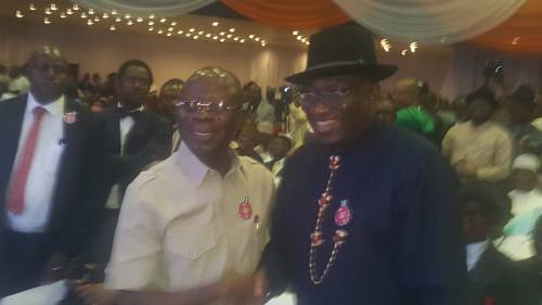 Obasanjo arrived at the hall at about 2:00pm, with the crowd hailing in deafening shouts of “Baba, Baba, Baba”. Oshiomole, who also walked in few minutes after Obasanjo, went straight to the celebrant, Goodluck Jonathan, and exchanged greetings him while people were shouting “Osho Baba, Osho Baba, Osho Baba”.