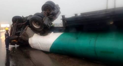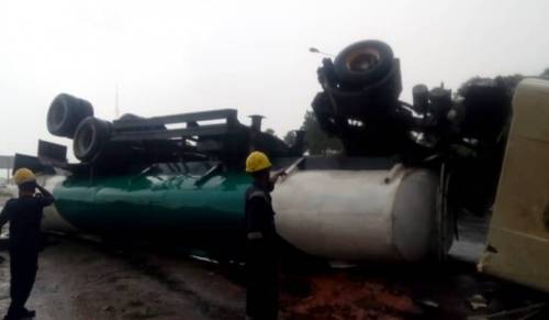 “The Fallen Tanker is loaded with diesel, all emergency responders @ the scene of the incident. Road cordoned off for immediate recovery. Motorists are implored ti be patient on this one.