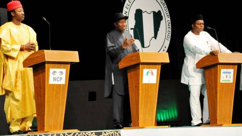 In 2015, Buhari failed to attend the NEDG debate (pictured), even though then incumbent President Goodluck Jonathan participated.