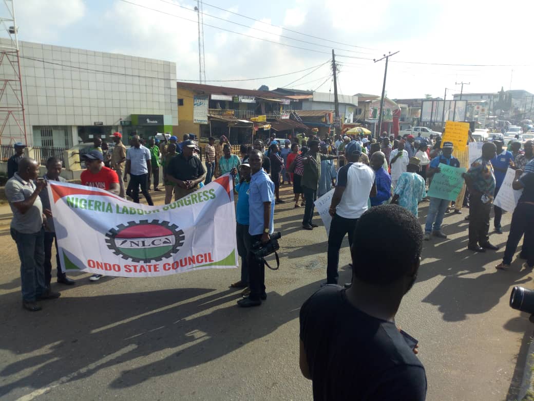 The unionists, who were armed with placards of various inscriptions, went through the major roads of Akure.